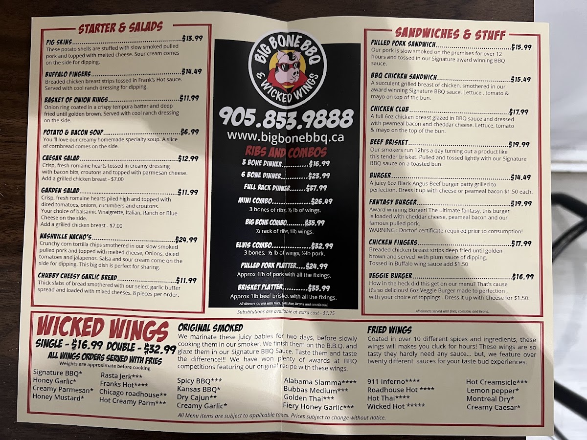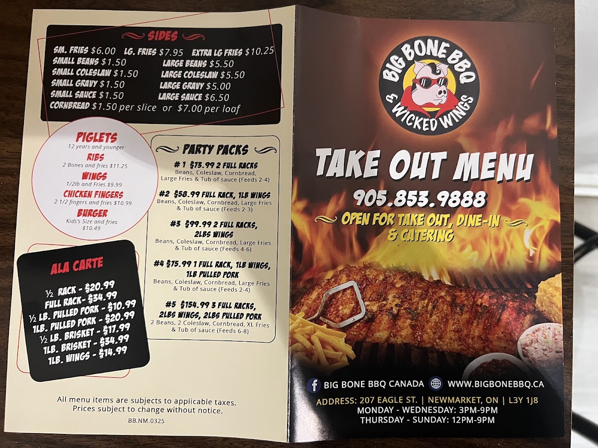 Welcome to Big Bone BBQ, a haven for barbecue lovers located at 207 Eagle St, Newmarket, ON. This popular spot has garnered rave reviews for its mouthwatering menu. Whether you're diving into the signature smoked barbecue chicken wings or relishing the beef ribs that practically melt in your mouth, each dish promises an explosion of flavor.